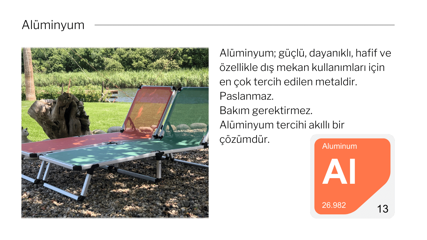 Alüminyum Katlanır Şezlonglarımız; hafif ve dayanıklı yapıları sayesinde her türlü ortamda mükemmel kullanım sağlar.